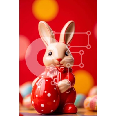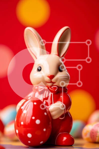 Υπάρχει δυνατότητα προσωποποίησης με δική σας φωτογραφία και προσαρμογής διαστάσεων κατόπιν παραγγελίας. Το συγεκεριμενο puzzle παρουσιαζει Αυτή η εικόνα παρουσιάζει ένα κόκκινο ειδώλιο κουνελιού με ένα πασχαλινό αυγό στο στόμα του, τοποθετημένο μπροστά από πολλά πολύχρωμα πασχαλινά αυγά διάσπαρτα γύρω από την επιφάνεια του τραπεζιού. Το κουνέλι φαίνεται να κρατά το αυγό καθώς κάθεται από πάνω του, υποδηλώνοντας ό