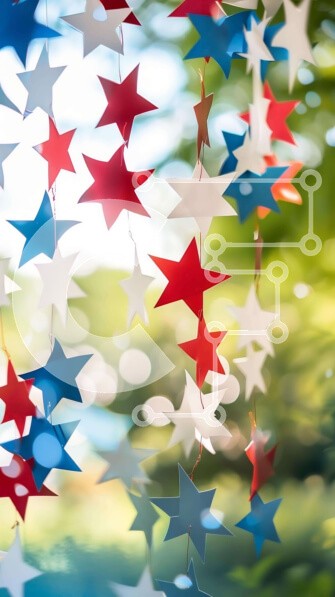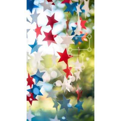 Υπάρχει δυνατότητα προσωποποίησης με δική σας φωτογραφία και προσαρμογής διαστάσεων κατόπιν παραγγελίας. Το συγεκεριμενο puzzle παρουσιαζει Η εικόνα δείχνει μια ζωντανή απεικόνιση κόκκινων, λευκών και μπλε χάρτινων αστεριών που κρέμονται από την οροφή, πιθανότατα για έναν εορτασμό της Ημέρας της Ανεξαρτησίας. Τα διακοσμητικά είναι διάσπαρτα σε μια αυλή ή κήπο, συνοδευόμενα από πλούσια βλάστηση στο βάθος, ενισχύοντ