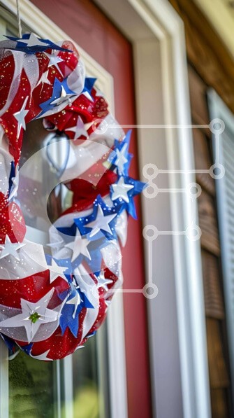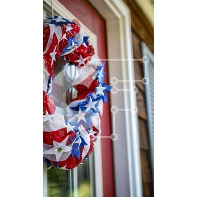 Υπάρχει δυνατότητα προσωποποίησης με δική σας φωτογραφία και προσαρμογής διαστάσεων κατόπιν παραγγελίας. Το συγεκεριμενο puzzle παρουσιαζει Η εικόνα παρουσιάζει ένα κόκκινο, λευκό και μπλε πατριωτικό στεφάνι κρεμασμένο στην εξώπορτα μιας πολυκατοικίας. Το στεφάνι είναι διακοσμημένο με αστέρια και ρίγες, που συμβολίζουν την ανεξαρτησία των Ηνωμένων Πολιτειών. Μπορεί να βρεθεί σε διάφορες τοποθεσίες γύρω από το σπίτ