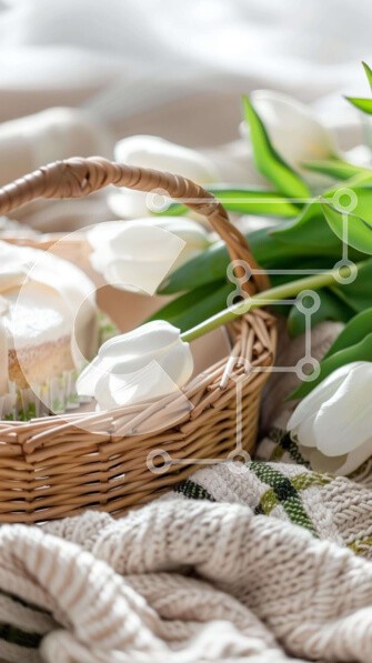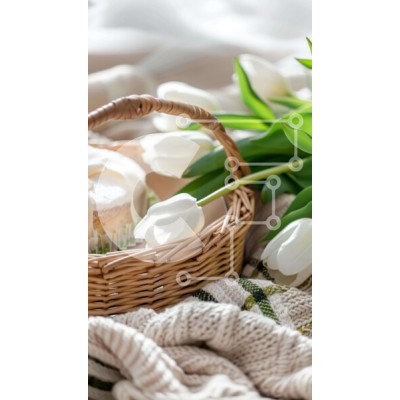 Υπάρχει δυνατότητα προσωποποίησης με δική σας φωτογραφία και προσαρμογής διαστάσεων κατόπιν παραγγελίας. Το συγεκεριμενο puzzle παρουσιαζει Η εικόνα δείχνει ένα καλάθι γεμάτο με λευκές τουλίπες και ένα μικρό κέικ, πιθανώς ένα επιδόρπιο με θέμα το Πάσχα. Φρέσκα λουλούδια είναι διάσπαρτα γύρω από τη σκηνή, δημιουργώντας μια εορταστική και κομψή εμφάνιση. Ένα μοναδικό puzzle που συνδυάζει ποιότητα, αισθητική και εμπ