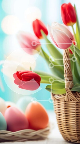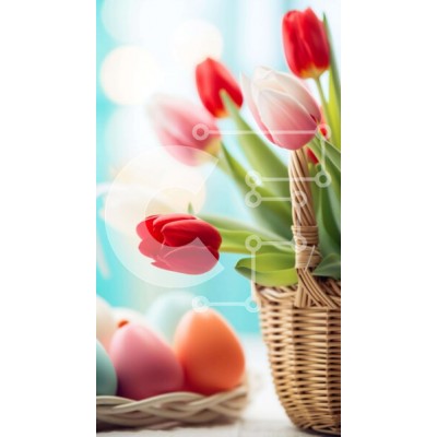 Υπάρχει δυνατότητα προσωποποίησης με δική σας φωτογραφία και προσαρμογής διαστάσεων κατόπιν παραγγελίας. Το συγεκεριμενο puzzle παρουσιαζει Αυτή η εικόνα παρουσιάζει ένα ψάθινο καλάθι γεμάτο με κόκκινες και λευκές τουλίπες, μαζί με πολύχρωμα πασχαλινά αυγά. Τα λουλούδια και τα αυγά εμφανίζονται σε περίοπτη θέση στο καλάθι, δημιουργώντας μια ζωντανή και εορταστική σκηνή. Γύρω από το καλάθι υπάρχουν πιάτα, κύπελλα κ