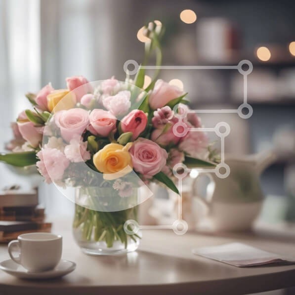 Υπάρχει δυνατότητα προσωποποίησης με δική σας φωτογραφία και προσαρμογής διαστάσεων κατόπιν παραγγελίας. Το συγεκεριμενο puzzle παρουσιαζει Αυτή η εικόνα παρουσιάζει ένα εσωτερικό σκηνικό με ένα γυάλινο βάζο γεμάτο με ροζ, κίτρινα και λευκά τριαντάφυλλα. Ένα φλιτζάνι καφέ τοποθετείται στο τραπέζι δίπλα στο βάζο, δημιουργώντας μια ζεστή και φιλόξενη ατμόσφαιρα. Αρκετά βιβλία είναι διάσπαρτα σε όλο το δωμάτιο, προσθ