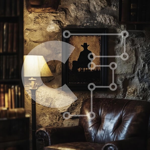 Υπάρχει δυνατότητα προσωποποίησης με δική σας φωτογραφία και προσαρμογής διαστάσεων κατόπιν παραγγελίας. Το συγεκεριμενο puzzle παρουσιαζει Η εικόνα απεικονίζει έναν άνετο εσωτερικό χώρο με μια δερμάτινη πολυθρόνα, μια λάμπα που ρίχνει απαλό φως και μια πλαισιωμένη σιλουέτα ενός καουμπόη στον τοίχο. Το δωμάτιο διαθέτει πέτρινους τοίχους με υφή και ατμόσφαιρα που υποδηλώνει ζεστασιά και νοσταλγία. Ο φωτισμός δημιου