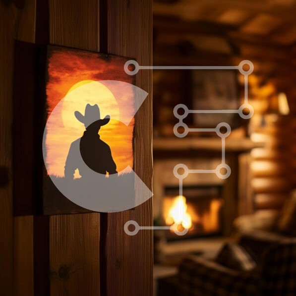 Υπάρχει δυνατότητα προσωποποίησης με δική σας φωτογραφία και προσαρμογής διαστάσεων κατόπιν παραγγελίας. Το συγεκεριμενο puzzle παρουσιαζει Η εικόνα παρουσιάζει ένα άνετο εσωτερικό μιας ξύλινης καμπίνας, που παρουσιάζει μια σιλουέτα ζωγραφικής ενός καουμπόη σε ένα ζωντανό φόντο ηλιοβασιλέματος. Οι ζεστοί τόνοι του πορτοκαλί και του κίτρινου στον πίνακα έρχονται σε αντίθεση με τις φυσικές ξύλινες υφές των τοίχων. Σ
