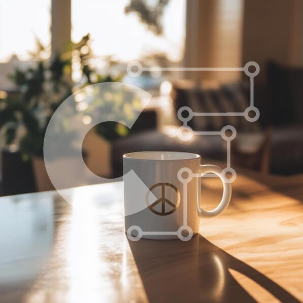 Υπάρχει δυνατότητα προσωποποίησης με δική σας φωτογραφία και προσαρμογής διαστάσεων κατόπιν παραγγελίας. Το συγεκεριμενο puzzle παρουσιαζει Αυτή η εικόνα παρουσιάζει μια λευκή κεραμική κούπα με ένα χρυσό σήμα ειρήνης πάνω της, τοποθετημένη σε ένα ξύλινο τραπέζι. Το ζεστό φως του ήλιου εισρέει μέσα από ένα παράθυρο, ρίχνοντας απαλές σκιές και ενισχύοντας τη ζεστή ατμόσφαιρα του εσωτερικού χώρου. Στο βάθος, υπάρχουν