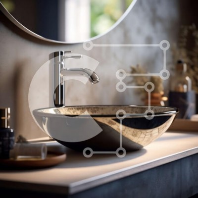 Υπάρχει δυνατότητα προσωποποίησης με δική σας φωτογραφία και προσαρμογής διαστάσεων κατόπιν παραγγελίας. Το συγεκεριμενο puzzle παρουσιαζει Αυτή η φωτογραφία δείχνει έναν μαύρο και χρυσό νεροχύτη να κάθεται σε έναν ανοιχτόχρωμο μαρμάρινο πάγκο σε ένα μπάνιο. Ο νεροχύτης έχει ένα μεγάλο στρογγυλό μπολ με κυρτή άκρη και μια μονή βρύση στο κέντρο. Ένας ορθογώνιος καθρέφτης κρέμεται πάνω από τον πάγκο, ενώ ένας μεγάλο