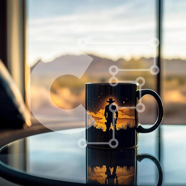 Υπάρχει δυνατότητα προσωποποίησης με δική σας φωτογραφία και προσαρμογής διαστάσεων κατόπιν παραγγελίας. Το συγεκεριμενο puzzle παρουσιαζει Αυτή η εικόνα παρουσιάζει μια μαύρη κούπα καφέ με μια σιλουέτα ενός καουμπόη ενάντια σε ένα πορτοκαλί ηλιοβασίλεμα, τοποθετημένη σε ένα ανακλαστικό γυάλινο τραπέζι. Στο βάθος, υπάρχουν βουνά και ένα απαλό, ζεστό φως που περνά από μεγάλα παράθυρα, δημιουργώντας μια γαλήνια ατμό