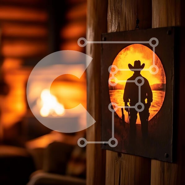 Υπάρχει δυνατότητα προσωποποίησης με δική σας φωτογραφία και προσαρμογής διαστάσεων κατόπιν παραγγελίας. Το συγεκεριμενο puzzle παρουσιαζει Αυτή η εικόνα παρουσιάζει ένα άνετο εσωτερικό καμπίνας με ζεστό φωτισμό που προέρχεται από ένα τζάκι στο φόντο. Μια σιλουέτα ενός καουμπόη πλαισιώνεται σε ένα κυκλικό έργο τέχνης που κρέμεται σε έναν ξύλινο τοίχο και τα ζεστά, λαμπερά χρώματα δημιουργούν μια φιλόξενη ατμόσφαιρ
