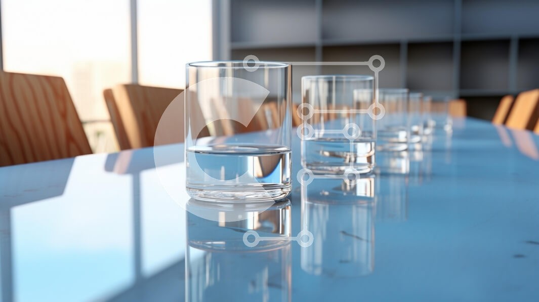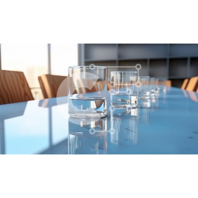 Υπάρχει δυνατότητα προσωποποίησης με δική σας φωτογραφία και προσαρμογής διαστάσεων κατόπιν παραγγελίας. Το συγεκεριμενο puzzle παρουσιαζει Η εικόνα παρουσιάζει ένα μακρύ τραπέζι συνεδριάσεων με μια γυαλισμένη επιφάνεια που αντανακλά το φως. Κατά μήκος του τραπεζιού είναι τοποθετημένα πολλά διάφανα γυάλινα ποτήρια γεμάτα νερό. Το σκηνικό φαίνεται μοντέρνο, με φόντο μεγάλα παράθυρα που επιτρέπουν στο φυσικό φως να