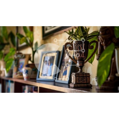 Υπάρχει δυνατότητα προσωποποίησης με δική σας φωτογραφία και προσαρμογής διαστάσεων κατόπιν παραγγελίας. Το συγεκεριμενο puzzle παρουσιαζει Η εικόνα παρουσιάζει ένα ράφι στολισμένο με κορνίζες, βάζα και τρόπαια. Ένα κεντρικό τρόπαιο μπαμπά τραβάει τα βλέμματα, που περιβάλλεται από δύο φυτά σε γλάστρες. Οι οικογενειακές φωτογραφίες είναι διάσπαρτες ανάμεσα στα αντικείμενα, αντανακλώντας πιθανότατα τις προσωπικές σχ