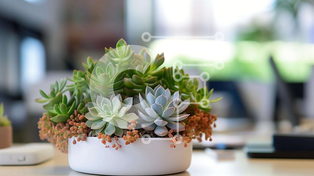 Υπάρχει δυνατότητα προσωποποίησης με δική σας φωτογραφία και προσαρμογής διαστάσεων κατόπιν παραγγελίας. Το συγεκεριμενο puzzle παρουσιαζει Αυτή η εικόνα παρουσιάζει ένα λευκό φυτό σε γλάστρα με παχύφυτα σε ένα γραφείο. Η γύρω επιφάνεια έχει πολλά άλλα φυτά, μερικά από τα οποία φυτρώνουν έξω από τη γλάστρα. Ένας φορητός υπολογιστής υπάρχει επίσης στο γραφείο, υποδεικνύοντας ότι αυτός ο χώρος μπορεί να χρησιμοποιηθ