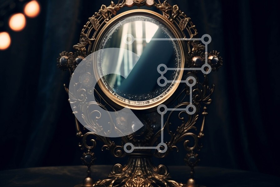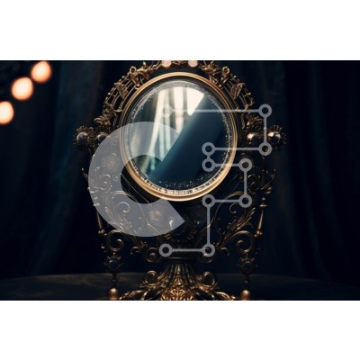 Υπάρχει δυνατότητα προσωποποίησης με δική σας φωτογραφία και προσαρμογής διαστάσεων κατόπιν παραγγελίας. Το συγεκεριμενο puzzle παρουσιαζει Αυτή η εικόνα είναι ενός περίτεχνου χρυσού καθρέφτη τοποθετημένου σε μια σκούρα ξύλινη βάση. Το πλαίσιο του καθρέφτη έχει περίπλοκα σκαλίσματα και η επιφάνεια του καθρέφτη είναι ελαφρώς παραμορφωμένη, δίνοντάς του μια αντίκα εμφάνιση. Ένας μόνο λαμπτήρας κρέμεται από την οροφή