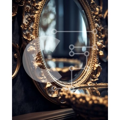 Υπάρχει δυνατότητα προσωποποίησης με δική σας φωτογραφία και προσαρμογής διαστάσεων κατόπιν παραγγελίας. Το συγεκεριμενο puzzle παρουσιαζει Αυτή η εικόνα απεικονίζει ένα κομψό και εκλεπτυσμένο δωμάτιο με μαύρο τοίχο στον οποίο κρέμεται ένας καθρέφτης με χρυσό πλαίσιο με περίτεχνα σκαλίσματα. Ο καθρέφτης φαίνεται ελαφρώς παραμορφωμένος, δίνοντάς του μια αντίκα εμφάνιση. Ένα μικρό τραπέζι τοποθετημένο δίπλα στον καθ
