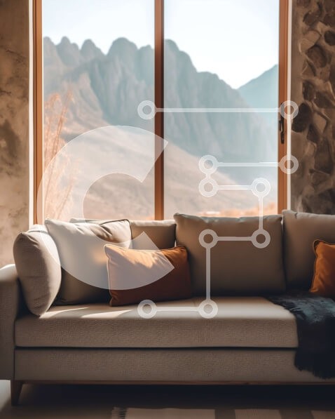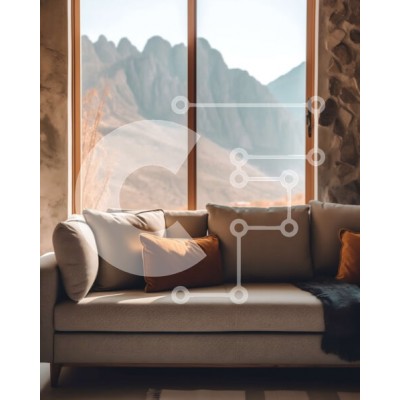 Υπάρχει δυνατότητα προσωποποίησης με δική σας φωτογραφία και προσαρμογής διαστάσεων κατόπιν παραγγελίας. Το συγεκεριμενο puzzle παρουσιαζει Αυτή η εικόνα παρουσιάζει ένα μοντέρνο σαλόνι με μεγάλο παράθυρο που προσφέρει εκπληκτική θέα σε μια οροσειρά. Το δωμάτιο είναι διακοσμημένο με έναν καφέ καναπέ, δύο πορτοκαλί μαξιλάρια και ένα ξύλινο τραπεζάκι. Οι πέτρινοι τοίχοι και το τζάκι προσθέτουν μια ζεστή πινελιά στο