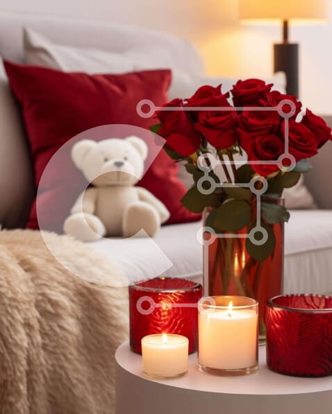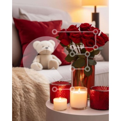 Υπάρχει δυνατότητα προσωποποίησης με δική σας φωτογραφία και προσαρμογής διαστάσεων κατόπιν παραγγελίας. Το συγεκεριμενο puzzle παρουσιαζει Αυτή η εικόνα δείχνει ένα σαλόνι διακοσμημένο με κόκκινα τριαντάφυλλα και κεριά. Το δωμάτιο έχει μια ζεστή ατμόσφαιρα, με διάσπαρτα μαξιλάρια για επιπλέον καθίσματα. Ένα αρκουδάκι κάθεται στο τραπέζι δίπλα σε ένα βάζο με λουλούδια, τοποθετημένο μπροστά από δύο κηροπήγια. Αυτή