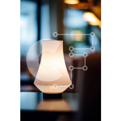 Υπάρχει δυνατότητα προσωποποίησης με δική σας φωτογραφία και προσαρμογής διαστάσεων κατόπιν παραγγελίας. Το συγεκεριμενο puzzle παρουσιαζει Αυτή η εικόνα δείχνει ένα λευκό φωτιστικό σε ένα ξύλινο τραπέζι μπροστά από ένα παράθυρο με περσίδες. Το φωτιστικό έχει λευκή απόχρωση και λεπτή βάση, ενώ το τραπέζι καλύπτεται με λευκό τραπεζομάντιλο και διαθέτει βάζο με λουλούδια. Το δωμάτιο φαίνεται να είναι μια τραπεζαρία,