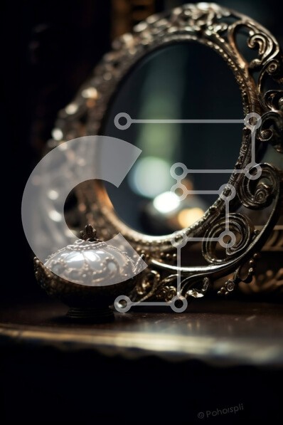 Υπάρχει δυνατότητα προσωποποίησης με δική σας φωτογραφία και προσαρμογής διαστάσεων κατόπιν παραγγελίας. Το συγεκεριμενο puzzle παρουσιαζει Αυτή η εικόνα είναι ενός περίτεχνου καθρέφτη που κάθεται σε ένα τραπέζι σε ένα δωμάτιο με χαμηλό φωτισμό. Ο καθρέφτης έχει διακοσμητικό πλαίσιο με περίπλοκα σχέδια και η επιφάνεια είναι ελαφρώς παραμορφωμένη, δίνοντάς του μια αντίκα εμφάνιση. Ένας μόνο λαμπτήρας κρέμεται από τ