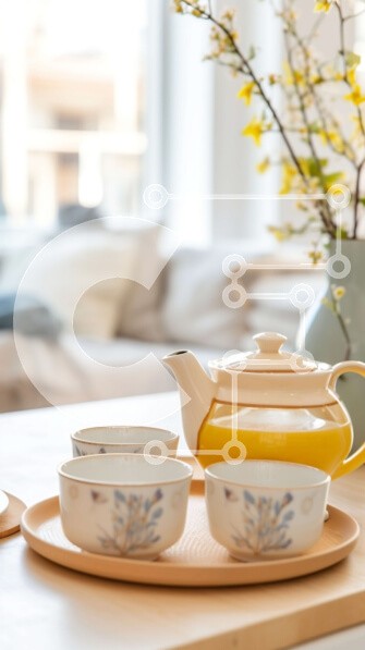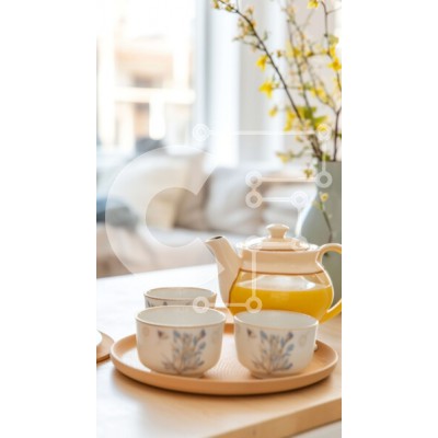 Υπάρχει δυνατότητα προσωποποίησης με δική σας φωτογραφία και προσαρμογής διαστάσεων κατόπιν παραγγελίας. Το συγεκεριμενο puzzle παρουσιαζει Αυτή η εικόνα παρουσιάζει μια όμορφη σύνθεση νεκρής φύσης. Διαθέτει ξύλινο τραπέζι με ανοιχτόχρωμο τραπεζομάντιλο, στολισμένο με δύο κίτρινα κεραμικά ποτήρια και μια τσαγιέρα. Μπροστά από τα κύπελλα, υπάρχει ένα βάζο με λουλούδια που προσθέτουν μια επιπλέον πινελιά ομορφιάς στ