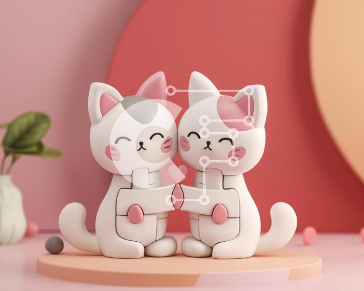 Υπάρχει δυνατότητα προσωποποίησης με δική σας φωτογραφία και προσαρμογής διαστάσεων κατόπιν παραγγελίας. Το συγεκεριμενο puzzle παρουσιαζει Αυτή η εικόνα παρουσιάζει δύο λευκά και ροζ ειδώλια γάτας που κάθονται πάνω σε ροζ φόντο. Βρίσκονται σε κοντινή απόσταση μεταξύ τους, με τον έναν να κρατά το χέρι του άλλου. Ένα μικρό φυτό σε γλάστρα είναι επίσης παρόν στη σκηνή, προσθέτοντας στη γοητεία της συνολικής σύνθεσης