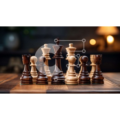 Υπάρχει δυνατότητα προσωποποίησης με δική σας φωτογραφία και προσαρμογής διαστάσεων κατόπιν παραγγελίας. Το συγεκεριμενο puzzle παρουσιαζει Αυτή η εικόνα παρουσιάζει μια σκακιέρα με σχολαστικά διατεταγμένα ασπρόμαυρα πιόνια σκακιού. Η σανίδα είναι τοποθετημένη σε ένα ξύλινο τραπέζι και υπάρχει ένα αμυδρό φως στο φόντο, που προσθέτει στη συνολική ατμόσφαιρα. Η σύνθεση αναδεικνύει τη στρατηγική φύση του παιχνιδιού σ