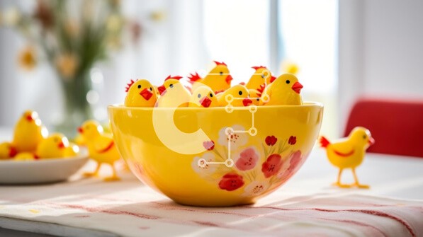 Υπάρχει δυνατότητα προσωποποίησης με δική σας φωτογραφία και προσαρμογής διαστάσεων κατόπιν παραγγελίας. Το συγεκεριμενο puzzle παρουσιαζει Αυτή η εικόνα παρουσιάζει ένα κίτρινο μπολ γεμάτο με πολλά μικρά ειδώλια κοτόπουλου τοποθετημένα στο κέντρο του τραπεζιού. Ένα άδειο μπολ φαίνεται επίσης στο πλάι, προσθέτοντας στη συνολική αίσθηση διασκέδασης και ευθυμίας. Ένα μοναδικό puzzle που συνδυάζει ποιότητα, αισθητικ