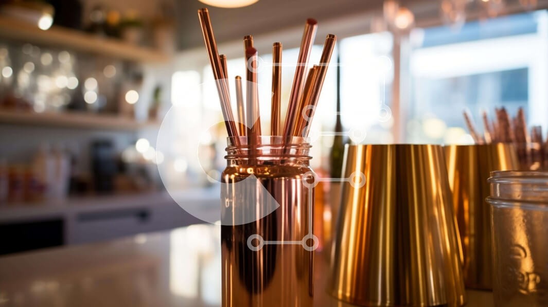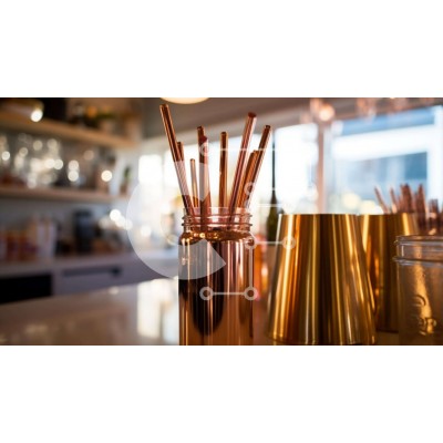 Υπάρχει δυνατότητα προσωποποίησης με δική σας φωτογραφία και προσαρμογής διαστάσεων κατόπιν παραγγελίας. Το συγεκεριμενο puzzle παρουσιαζει Αυτή η εικόνα παρουσιάζει μια συλλογή από χάλκινα καλαμάκια που εκτίθενται σε ένα άδειο βάζο σε έναν πάγκο μπαρ. Γύρω από το βάζο υπάρχουν μπουκάλια και βάζα, υποδεικνύοντας την πιθανή χρήση τους για την παρασκευή ποτών ή κοκτέιλ. Υπάρχουν επίσης πολλά ποτήρια, ενισχύοντας τη