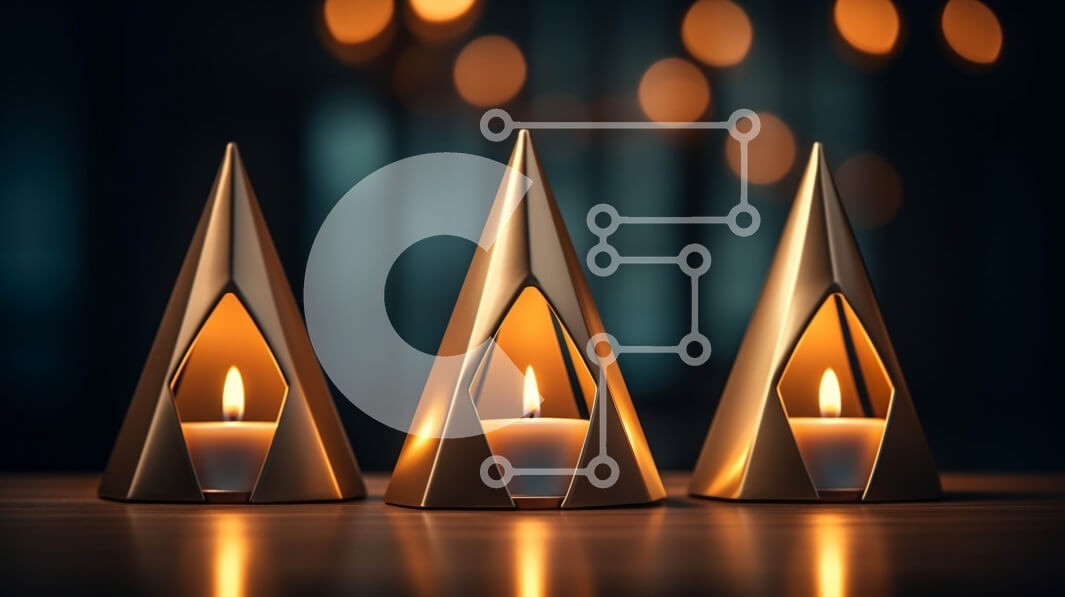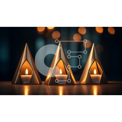 Υπάρχει δυνατότητα προσωποποίησης με δική σας φωτογραφία και προσαρμογής διαστάσεων κατόπιν παραγγελίας. Το συγεκεριμενο puzzle παρουσιαζει Αυτή η εικόνα παρουσιάζει τρεις χρυσές θήκες σε σχήμα πυραμίδας σε μια σκούρα ξύλινη επιφάνεια. Κάθε πυραμίδα περιέχει ένα μικρό αναμμένο κερί που τρεμοπαίζει και ρίχνει σκιές στον τοίχο πίσω. Το φόντο είναι θολό και υπάρχουν μακρινά έντονα φώτα που προσθέτουν στη συνολική ατμ
