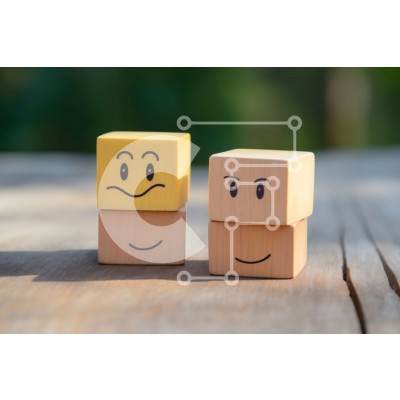 Υπάρχει δυνατότητα προσωποποίησης με δική σας φωτογραφία και προσαρμογής διαστάσεων κατόπιν παραγγελίας. Το συγεκεριμενο puzzle παρουσιαζει Αυτή η εικόνα παρουσιάζει δύο ξύλινα μπλοκ με χαμογελαστά πρόσωπα ζωγραφισμένα πάνω τους. Το ένα μπλοκ έχει ένα κίτρινο χαμογελαστό πρόσωπο με μαύρα μάτια, μύτη και στόμα, ενώ το άλλο μπλοκ έχει ένα μπλε χαμογελαστό πρόσωπο με λευκά μάτια, μύτη και στόμα. Τα μπλοκ στοιβάζονται
