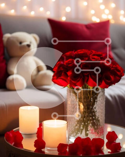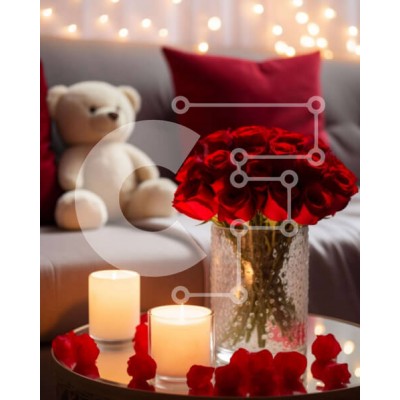 Υπάρχει δυνατότητα προσωποποίησης με δική σας φωτογραφία και προσαρμογής διαστάσεων κατόπιν παραγγελίας. Το συγεκεριμενο puzzle παρουσιαζει Αυτή η εικόνα παρουσιάζει μια ρομαντική γιορτή του Αγίου Βαλεντίνου σε ένα σαλόνι. Ένα γυάλινο βάζο γεμάτο με κόκκινα τριαντάφυλλα και κεριά βρίσκεται στο επίκεντρο ενός τραπεζιού σαλονιού, ενώ ένα αρκουδάκι προσθέτει μια πινελιά γλυκύτητας. Δύο κηροπήγια τοποθετημένα σε κάθε