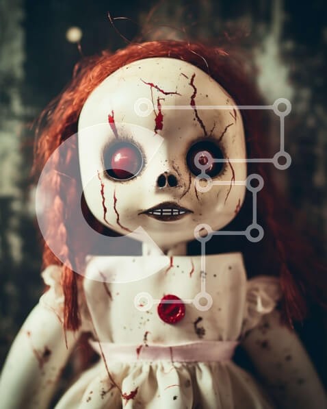 Υπάρχει δυνατότητα προσωποποίησης με δική σας φωτογραφία και προσαρμογής διαστάσεων κατόπιν παραγγελίας. Το συγεκεριμενο puzzle παρουσιαζει Αυτή η εικόνα παρουσιάζει μια κούκλα με καστανοκόκκινα μαλλιά και κόκκινα μάτια. Η κούκλα κάθεται μπροστά σε ένα σκούρο φόντο, δημιουργώντας μια στοιχειωμένη ατμόσφαιρα. Φαίνεται να είναι διακοσμημένο με κασκόλ, μακιγιάζ και κοσμήματα, προσθέτοντας στην απόκοσμη εμφάνισή του.