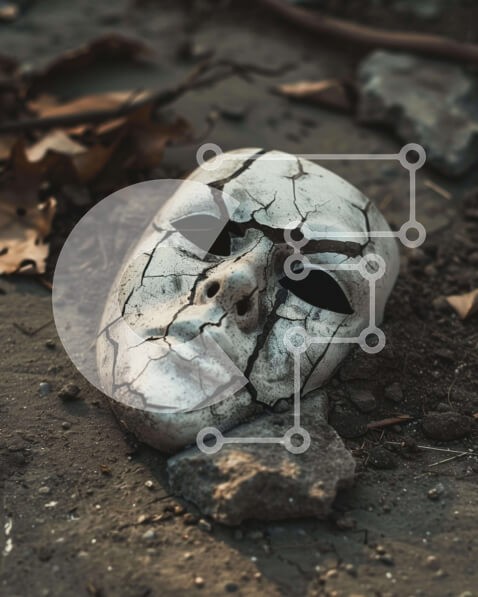 Υπάρχει δυνατότητα προσωποποίησης με δική σας φωτογραφία και προσαρμογής διαστάσεων κατόπιν παραγγελίας. Το συγεκεριμενο puzzle παρουσιαζει Η εικόνα παρουσιάζει μια σπασμένη, ραγισμένη μάσκα ξαπλωμένη στο έδαφος κοντά σε πέτρες και φύλλα. Είναι πιθανό ότι η μάσκα αφέθηκε εκεί από κάποιον που ήθελε να εκφράσει τη δική του αίσθηση απόγνωσης ή μοναξιάς. Η παρουσία της σπασμένης μάσκας στη σκηνή υποδηλώνει ότι μπορεί