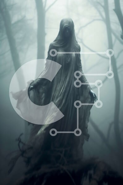 Υπάρχει δυνατότητα προσωποποίησης με δική σας φωτογραφία και προσαρμογής διαστάσεων κατόπιν παραγγελίας. Το συγεκεριμενο puzzle παρουσιαζει Αυτή η εικόνα παρουσιάζει μια μυστηριώδη γυναίκα που φορά ένα μακρύ, ρέον φόρεμα που στέκεται στη μέση ενός σκοτεινού και ομιχλώδους δάσους. Το πρόσωπό της κρύβεται από μια κουκούλα και τα μάτια της λάμπουν κόκκινα. Τα δέντρα γύρω της είναι τσακισμένα και στριμμένα, και το έδα
