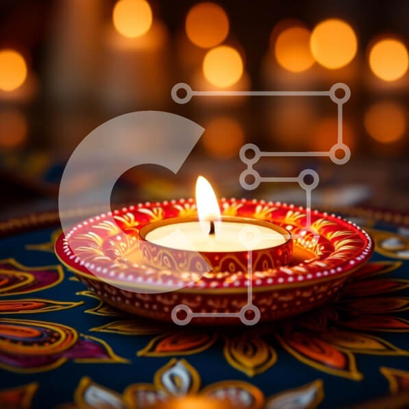 Υπάρχει δυνατότητα προσωποποίησης με δική σας φωτογραφία και προσαρμογής διαστάσεων κατόπιν παραγγελίας. Το συγεκεριμενο puzzle παρουσιαζει Η εικόνα παρουσιάζει ένα αναμμένο κερί σε ένα περίτεχνα διακοσμημένο κεραμικό πιάτο, με κεριά να το περιβάλλουν. Είναι πιθανό να χρησιμοποιηθεί κατά τη διάρκεια του εορτασμού του Diwali, μιας από τις πιο σημαντικές θρησκευτικές γιορτές στην Ινδία. Το πολύχρωμο σχέδιο στο τραπε