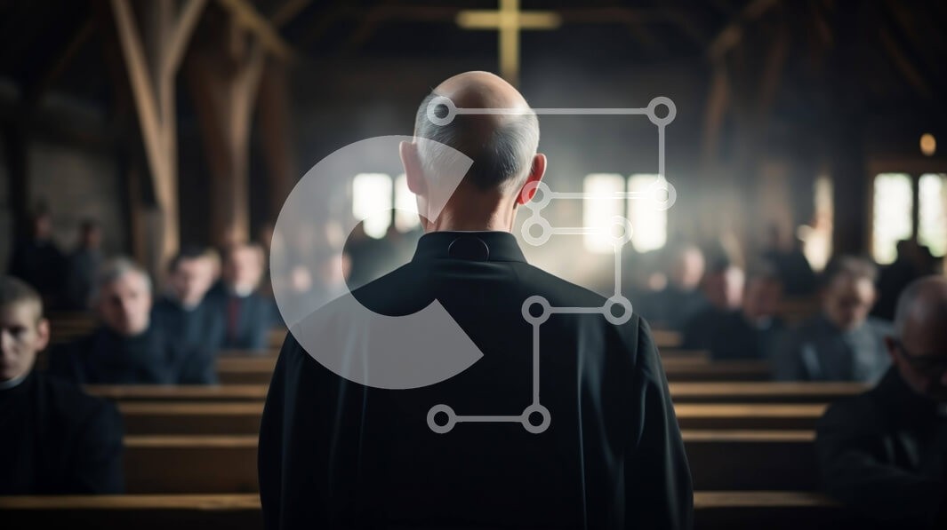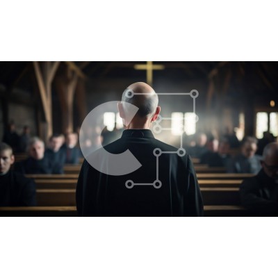 Υπάρχει δυνατότητα προσωποποίησης με δική σας φωτογραφία και προσαρμογής διαστάσεων κατόπιν παραγγελίας. Το συγεκεριμενο puzzle παρουσιαζει Αυτή η εικόνα απεικονίζει έναν ιερέα να στέκεται στα στασίδια μιας άδειας εκκλησίας, με πολλούς ανθρώπους να κάθονται γύρω του. Η πλάτη του ιερέα είναι στραμμένη προς την κάμερα, υποδηλώνοντας την εστίασή του σε κάτι ή σε κάποιον πίσω του. Οι σταυροί στην οροφή της εκκλησίας τ