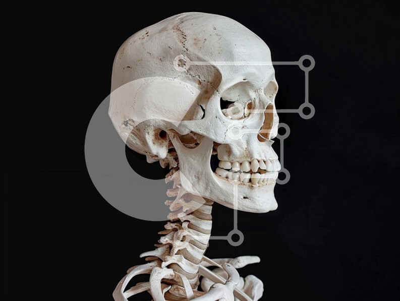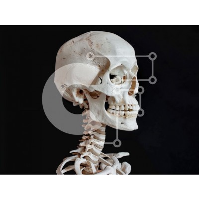 Υπάρχει δυνατότητα προσωποποίησης με δική σας φωτογραφία και προσαρμογής διαστάσεων κατόπιν παραγγελίας. Το συγεκεριμενο puzzle παρουσιαζει Αυτή η εικόνα παρουσιάζει ένα μοντέλο ανθρώπινου σκελετού, που δείχνει το κρανίο και τους αυχενικούς σπονδύλους. Ο σκελετός εμφανίζεται με μαύρο φόντο, τονίζοντας τη λεπτομερή δομή του. Τα χαρακτηριστικά του κρανίου, συμπεριλαμβανομένων των κόγχων των ματιών και της γνάθου, εί