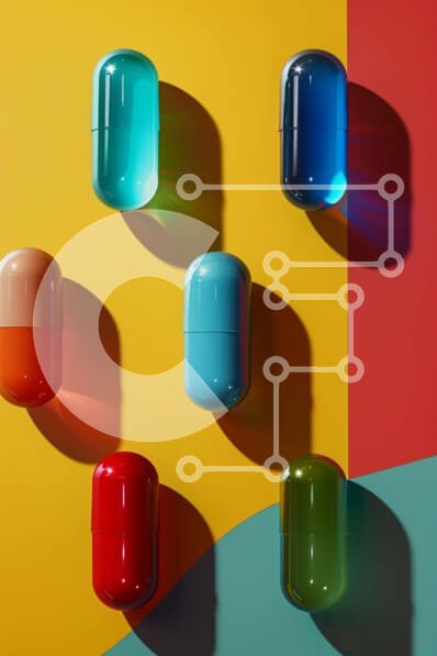 Υπάρχει δυνατότητα προσωποποίησης με δική σας φωτογραφία και προσαρμογής διαστάσεων κατόπιν παραγγελίας. Το συγεκεριμενο puzzle παρουσιαζει Αυτή η εικόνα παρουσιάζει έξι πολύχρωμες κάψουλες χαπιών τοποθετημένες σε ένα ζωντανό, πολύχρωμο φόντο. Κάθε χάπι διαφέρει σε μέγεθος και σχήμα, υποδεικνύοντας ξεχωριστούς σκοπούς. Επιπλέον, άδεια μπουκάλια χαπιών είναι διάσπαρτα τριγύρω, υπονοώντας την παρουσία πολλαπλών τύπω