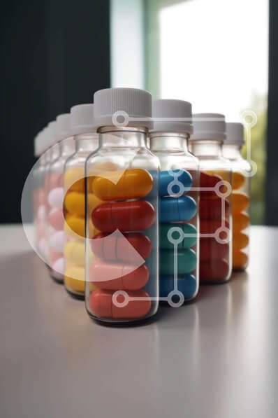 Υπάρχει δυνατότητα προσωποποίησης με δική σας φωτογραφία και προσαρμογής διαστάσεων κατόπιν παραγγελίας. Το συγεκεριμενο puzzle παρουσιαζει Αυτή η εικόνα παρουσιάζει μια ομάδα από πολύχρωμα μπουκάλια χαπιών τοποθετημένα τακτοποιημένα σε ένα τραπέζι. Τα μπουκάλια περιέχουν διάφορους τύπους χαπιών, τα οποία μπορούν να χρησιμοποιηθούν για διαφορετικούς σκοπούς, όπως φάρμακα ή συμπληρώματα διατροφής. Στο βάθος, υπάρχο
