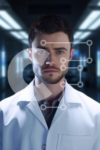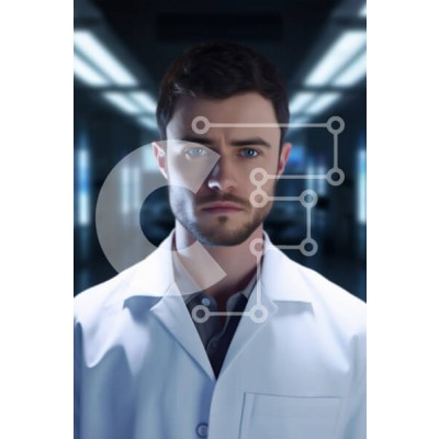 Υπάρχει δυνατότητα προσωποποίησης με δική σας φωτογραφία και προσαρμογής διαστάσεων κατόπιν παραγγελίας. Το συγεκεριμενο puzzle παρουσιαζει Η εικόνα απεικονίζει έναν νεαρό άνδρα με εντυπωσιακά μπλε μάτια, φορώντας ένα λευκό παλτό εργαστηρίου πάνω από ένα γκρι πουκάμισο. Έχει περιποιημένα γένια και εμφανίζεται σοβαρός, στραμμένος κατευθείαν στην κάμερα. Το φόντο είναι απαλά θολό, υποδηλώνοντας ένα κλινικό ή εργαστη