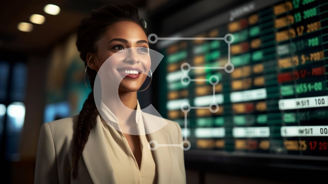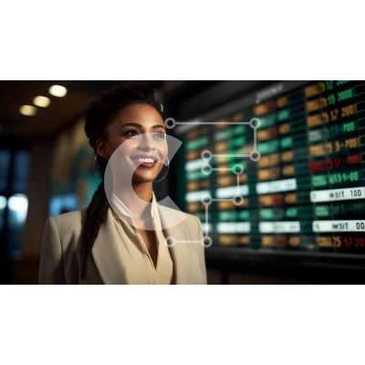 Υπάρχει δυνατότητα προσωποποίησης με δική σας φωτογραφία και προσαρμογής διαστάσεων κατόπιν παραγγελίας. Το συγεκεριμενο puzzle παρουσιαζει Η εικόνα δείχνει μια επιχειρηματία να στέκεται μπροστά από έναν ηλεκτρονικό πίνακα με τις τιμές των μετοχών να εμφανίζονται σε αυτόν. Χαμογελάει και φαίνεται να απολαμβάνει τον εαυτό της καθώς κοιτάζει την οθόνη, κάτι που μπορεί να δείχνει ότι εργάζεται σε γραφείο ή χρηματοπισ