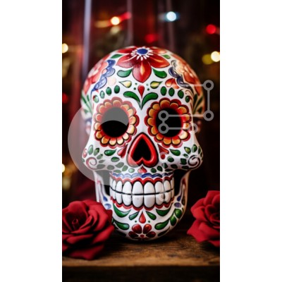 Υπάρχει δυνατότητα προσωποποίησης με δική σας φωτογραφία και προσαρμογής διαστάσεων κατόπιν παραγγελίας. Το συγεκεριμενο Puzzle 10x10 cm – 25 κομμ παρουσιαζει Αυτή η εικόνα παρουσιάζει ένα πολύχρωμο, περίπλοκα σχεδιασμένο ζαχαροκεφαλάκι, που συνήθως συνδέεται με τον εορτασμό της Ημέρας των Νεκρών (Dâ de los Muertos). Το κρανίο είναι διακοσμημένο με ζωηρά λουλουδάτα μοτίβα σε κόκκινο, πράσινο, μπλε