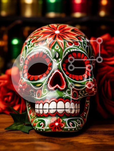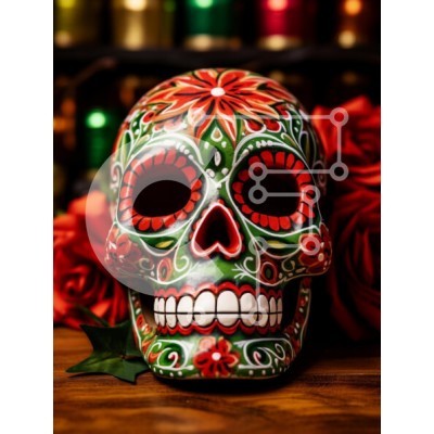 Υπάρχει δυνατότητα προσωποποίησης με δική σας φωτογραφία και προσαρμογής διαστάσεων κατόπιν παραγγελίας. Το συγεκεριμενο Puzzle 10x10 cm – 25 κομμ παρουσιαζει Η εικόνα παρουσιάζει ένα ζωντανό και περίπλοκα σχεδιασμένο ζαχαροκεφαλο, που συνδέεται ευρέως με τους εορτασμούς της Ημέρας των Νεκρών στο Μεξικό. Το κρανίο είναι διακοσμημένο με πολύχρωμα λουλουδάτα μοτίβα σε κόκκινο και πράσινο, που ξεχωρί