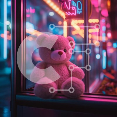 Υπάρχει δυνατότητα προσωποποίησης με δική σας φωτογραφία και προσαρμογής διαστάσεων κατόπιν παραγγελίας. Το συγεκεριμενο Puzzle 10x10 cm – 25 κομμ παρουσιαζει Αυτή η εικόνα παρουσιάζει ένα βελούδινο ροζ αρκουδάκι που κάθεται στην άκρη μιας γυάλινης οθόνης, που φωτίζεται από ζωντανά φώτα νέον σε ένα πολυσύχναστο αστικό περιβάλλον. Η αρκούδα έχει απαλή υφή και φιλική έκφραση, με τα στρογγυλά αυτιά κ