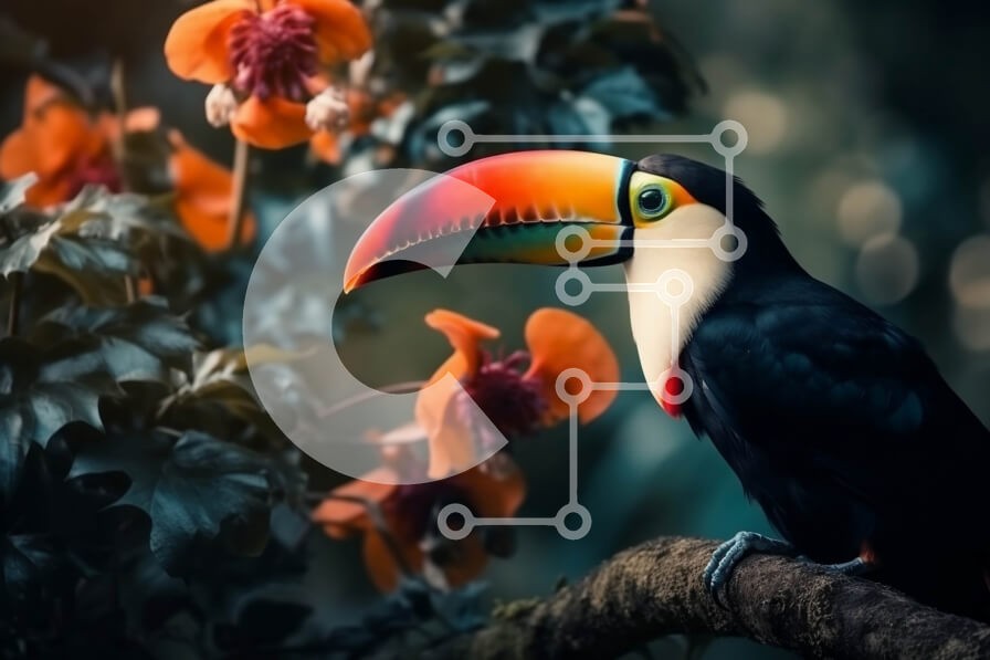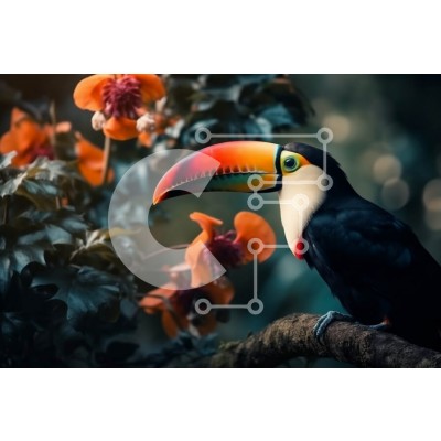 Υπάρχει δυνατότητα προσωποποίησης με δική σας φωτογραφία και προσαρμογής διαστάσεων κατόπιν παραγγελίας. Το συγεκεριμενο puzzle παρουσιαζει Αυτή η εικόνα δείχνει ένα πουλί τούκαν σκαρφαλωμένο σε ένα κλαδί σε ένα τροπικό δάσος. Το πουλί έχει έντονα χρωματιστά φτερά και ράμφος, με μαύρο και κίτρινο σώμα. Το φόντο είναι γεμάτο με καταπράσινο φύλλωμα και πολύχρωμα λουλούδια, με ακτίνες ηλιακού φωτός να διαπερνούν τα δ