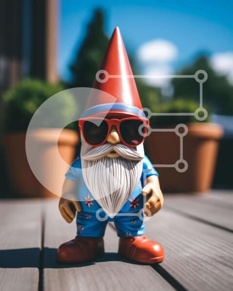 Υπάρχει δυνατότητα προσωποποίησης με δική σας φωτογραφία και προσαρμογής διαστάσεων κατόπιν παραγγελίας. Το συγεκεριμενο Puzzle 10x10 cm – 25 κομμ παρουσιαζει Η εικόνα δείχνει ένα παιχνίδι καλικάντζαρο στολισμένο με γυαλιά ηλίου και ζωηρά κόκκινα και μπλε ρούχα, τοποθετημένο σε ξύλινο κατάστρωμα κοντά σε φυτά ή λουλούδια σε γλάστρες. Φαίνεται να είναι ένα διακοσμητικό κομμάτι, που στέκεται μόνο το