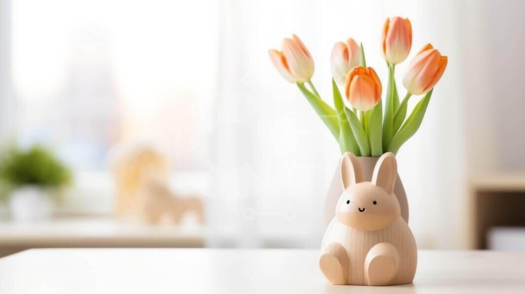Υπάρχει δυνατότητα προσωποποίησης με δική σας φωτογραφία και προσαρμογής διαστάσεων κατόπιν παραγγελίας. Το συγεκεριμενο puzzle παρουσιαζει Αυτή η εικόνα παρουσιάζει ένα ξύλινο βάζο γεμάτο με πορτοκαλί τουλίπες σε σχήμα κουνελιού. Τα λουλούδια δημιουργούν μια αξιολάτρευτη και γιορτινή διακόσμηση, ιδανική για την άνοιξη. Άλλα αντικείμενα όπως βάζα, βιβλία και μικρά ειδώλια μπορεί να φαίνονται στο τραπέζι και γύρω α