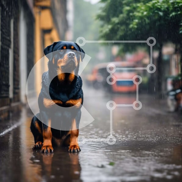 Υπάρχει δυνατότητα προσωποποίησης με δική σας φωτογραφία και προσαρμογής διαστάσεων κατόπιν παραγγελίας. Το συγεκεριμενο Puzzle 10x10 cm – 25 κομμ παρουσιαζει Η εικόνα δείχνει έναν μαύρο και καφέ σκύλο να κάθεται στο δρόμο στη βροχή. Είναι πιθανό ο σκύλος να περιμένει τον ιδιοκτήτη του να γυρίσει σπίτι, καθώς φαίνεται να απολαμβάνει τον υγρό καιρό. Υπάρχουν πολλά αυτοκίνητα που κυκλοφορούν στην πε
