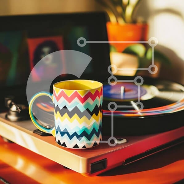 Υπάρχει δυνατότητα προσωποποίησης με δική σας φωτογραφία και προσαρμογής διαστάσεων κατόπιν παραγγελίας. Το συγεκεριμενο puzzle παρουσιαζει Η εικόνα παρουσιάζει μια ζωντανή κούπα καφέ με ζιγκ-ζαγκ μοτίβο τοποθετημένη σε ένα vintage πικάπ. Το πικάπ τοποθετείται σε ένα θολό φόντο από πολύχρωμα έργα τέχνης και ένα φυτό σε γλάστρα, δημιουργώντας μια ζεστή και καλλιτεχνική ατμόσφαιρα. Το ζεστό φως του ήλιου ενισχύει το