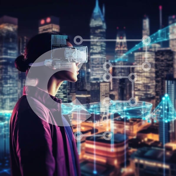 | Όνομα Προϊόντος | Intra Συλλεκτικό Ξύλινο Παζλ Plywood 4mm - Γυναίκα που φοράει γυαλιά VR μπροστά από τον φωτισμένο ορίζοντα της πόλης τη νύχτα Σε Ξύλινο Κουτί - Διαστάσεις Puzzle: 10x10 cm – 25 κομμάτια |