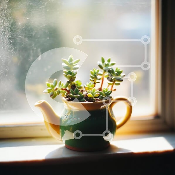 Υπάρχει δυνατότητα προσωποποίησης με δική σας φωτογραφία και προσαρμογής διαστάσεων κατόπιν παραγγελίας. Το συγεκεριμενο puzzle παρουσιαζει Η εικόνα παρουσιάζει μια γοητευτική διάταξη χυμώδους φυτού σε μια πολύχρωμη τσαγιέρα, τοποθετημένη σε ένα ηλιόλουστο περβάζι. Η τσαγιέρα είναι κυρίως πράσινη με κίτρινο στόμιο και λαβή, δημιουργώντας μια ζωηρή αντίθεση με το πράσινο των παχύφυτων. Το φως του ήλιου ρέει μέσα απ