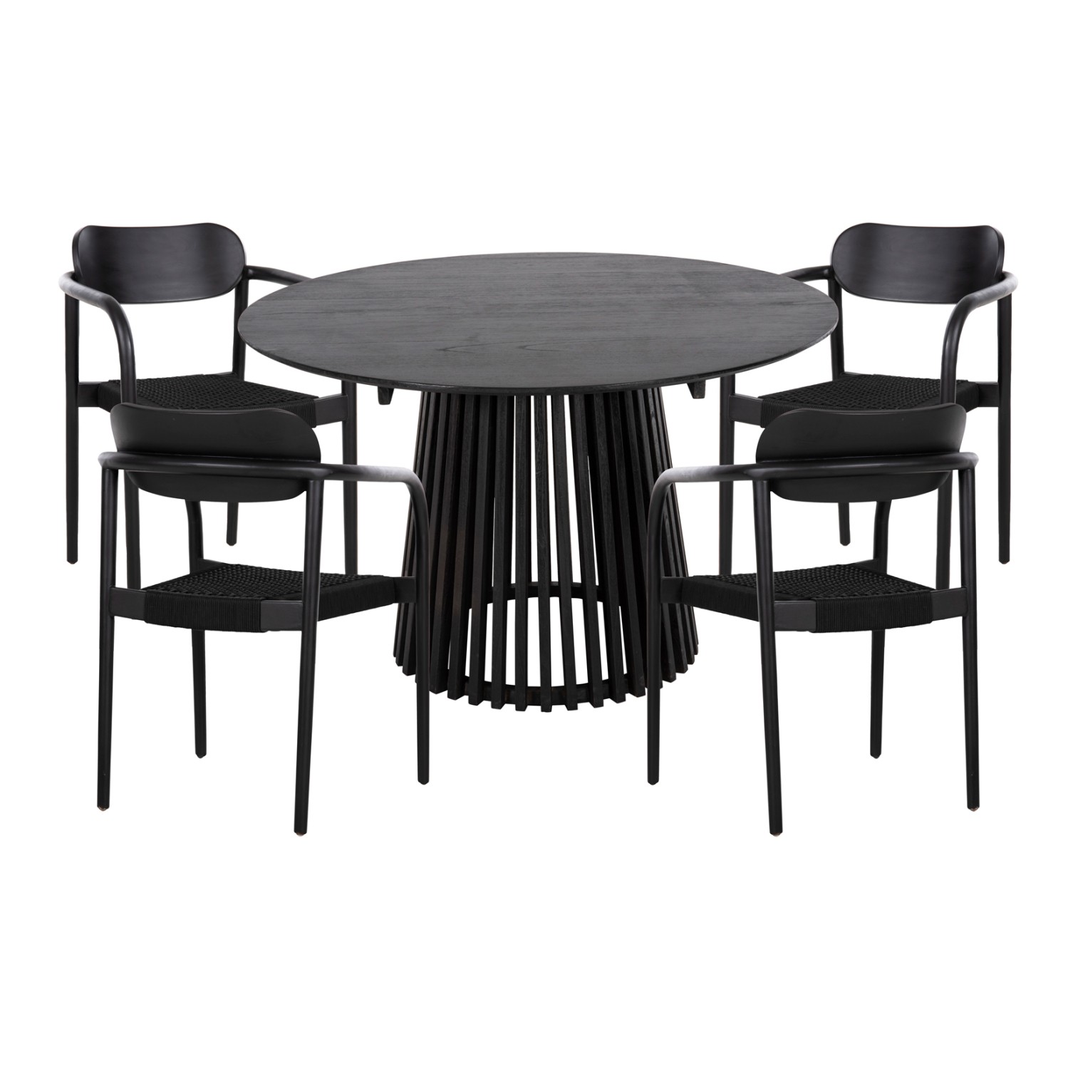 Αυτό το σετ τραπεζαρίας εσωτερικού χώρου 5τμχ αποτελείται από ένα στρογγυλό τραπέζι FRANTZ κατασκευασμένο εξολοκλήρου από ξύλο MINDI σε ΜΑΥΡΟ χρώμα, και από 4 καρέκλες τραπεζαρίας OSLO κατασκευασμένες εξολοκλήρου από ξύλο teak με κάθισμα από σχοινί σε ΜΑΥΡΟ χρώμα.